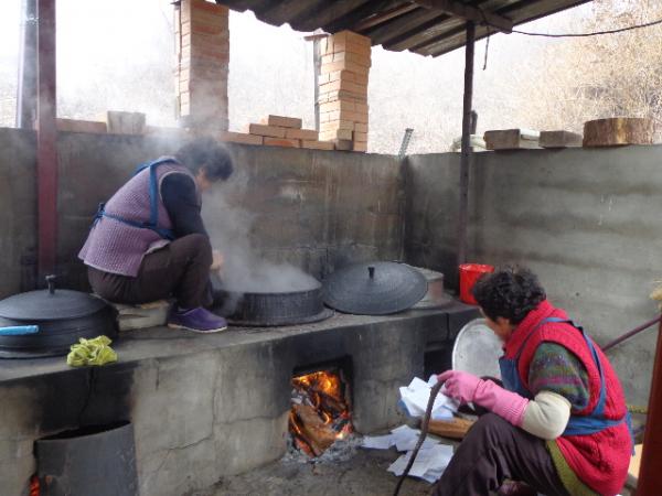 부산 갈매기와 보현심 보살님이 가마솥에 팥죽을 쑤는데 다 익으면